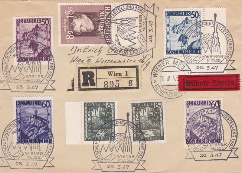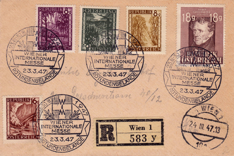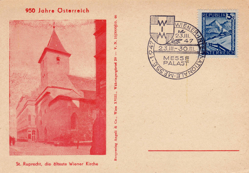 A collective show by the Austrian stamp dealers Association takes place from the 23rd to the 30th March 1947 in the Messepalast. It calls itself an Ö.P.A. (österreichische Postwertzeichen-Ausstellung). For the first time, the artistic designs submitted for all stamp series after 1945 will be exhibited; they are being graciously made available by the Generalpostdirektion. The public will have the opportunity to admire the artistic execution by experienced Austrian graphic designers and engravers. The state printing works will offer the visitors the object "The stamp as an article for export". Almost all the completed orders from Liechtenstein, Albania, Bulgaria, Iceland, Luxemburg. Montenegro, Norway, Persia, Sweden, Siam, Turkey etc. will be exhibited. Among the numerous other exhibits we find: From a specialized collection of the 1850 issue Lombardy Venetia; Austria 1850-1947, an extensive collection of USSR, classic stamps on cover, Bosnia with all its varieties, Confederate States of America, partisan mail. Further a nice diligent work by a 13-year old student who calls her exhibit "An animal stamp lexicon". For a change, artists have brought several tableaus such as "humour in philately", and "the laughing postage stamp". The 20th anniversary of the Austrian stamp dealers association was being honoured by two publicity booths being made available. At the special post office in the exhibition, the set of 8 for the Messe is issued.