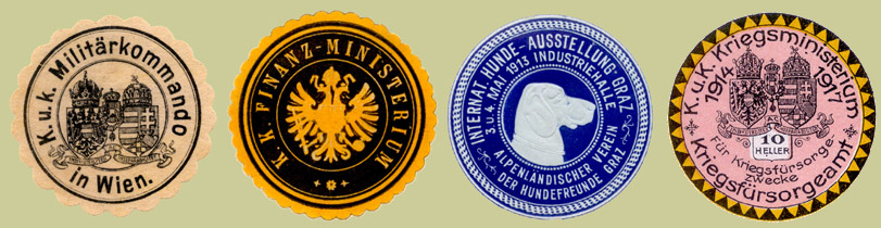Seal of the Vienna military command; Seal of the Finance ministry; Advert for the 1913 Graz dog show; WWI War Ministry charity seal