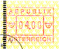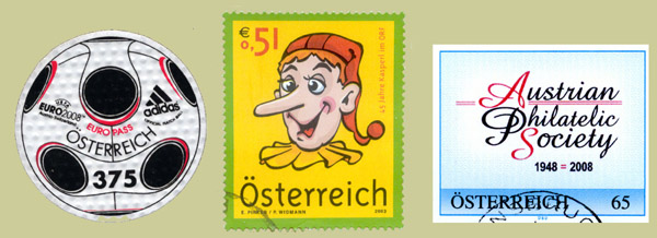These three items however are genuine Austrian postage stamps (yes they are!) just to show that life can be difficult. The round one is printed on plastic and the ‘375’ is the face value in cents; the long-nosed figure is a character from a childrens TV show; and the APS stamp is a Personal Stamp, discussed elsewhere.