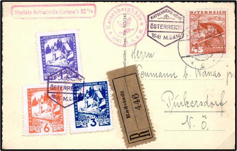 In the 1920-38 period, several hotels and guest houses in remote regions organised their own postal service, an employee taking guests mail to the nearest post office. This they charged for, and some printed and sold "adhesive labels indicating the payment for this service". This produced conflict with the postal authorities, who while refusing to collect mail from the hotels even if paid, also refused to allow anyone else to! One of the better-known examples is Katschberghöhe, on top of a mountain in Carinthia.