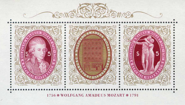 Austria occasionally produces block issues, having both postage stamps and non-postal labels. A good example is the 1991 "Mozart 200th death anniversary", with a central label flanked by stamps. As before, the label is not postally valid but can be found used. It is less uncommon on FDCs, where one can apply the left stamp alone, or the right stamp alone, or the left stamp plus the label, or… A greater source of such peculiar frankings comes from the 1969 3x3 block "100 years of the Vienna Opera House", which has a central label surrounded by 8 stamps; the catalogues list 16 possible arrangements that include the label!