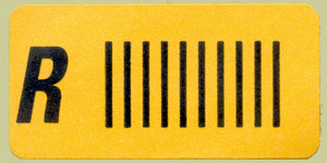 You may encounter the Registration label; these began in the traditional format of a small adhesive yellow label with the letter R, the name of the despatch office, and a serial number. More recently they take the form of a computer-produced label with a serial number such as "RO 75452432 8 AT" and a bar code; similar labels beginning RR or CC are used for other postal purposes. So why, you may ask, do you also find an added small yellow label containing only R and a row of vertical lines? Allegedly, it is because the Post Office machinery cannot recognise the Post Office computer-produced labels!