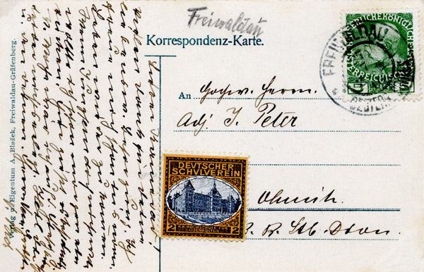 From an earlier time: political labels were printed in great quantities by German-speakers in areas they wanted to rule – especially in today’s Czech Republic & Slovakia. This is a Deutscher Schulverein label used at Freiwaldau in Silesia; the ‘2’ is the donation made to promote the cause of German culture and language tuition in schools.