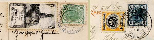 Below are two pieces of postcards, showing German labels used in Silesia next to the postage stamps on postcards. In theory that made the item into a letter, which would then be underfranked and charged postage due; in practice the rule was ignored if the label was in German.